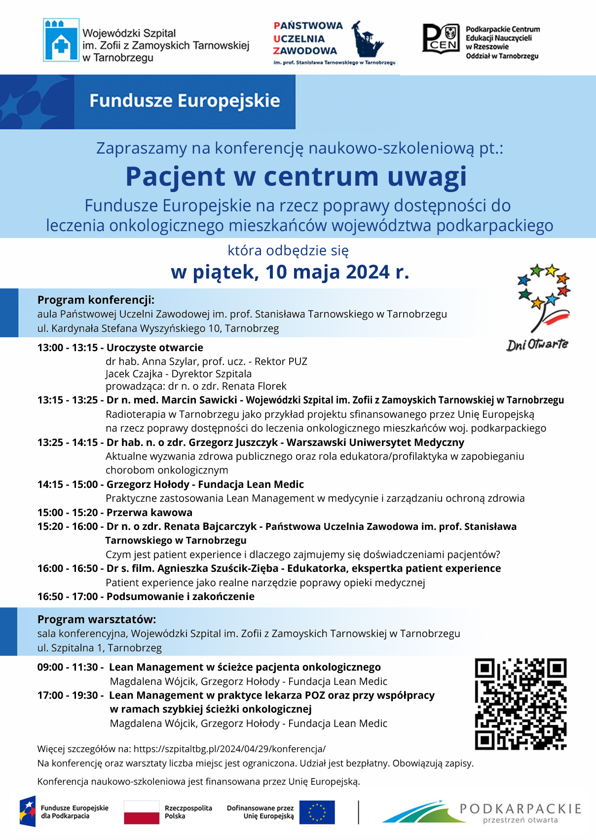 W ramach Dni Otwartych Funduszy Europejskich (DOFE) 2024 – Szpital w Tarnobrzegu organizuje konferencję naukowo-szkoleniową pt: „Pacjent w centrum uwagi. Fundusze Europejskie na rzecz poprawy dostępności do leczenia onkologicznego mieszkańców województwa podkarpackiego.”