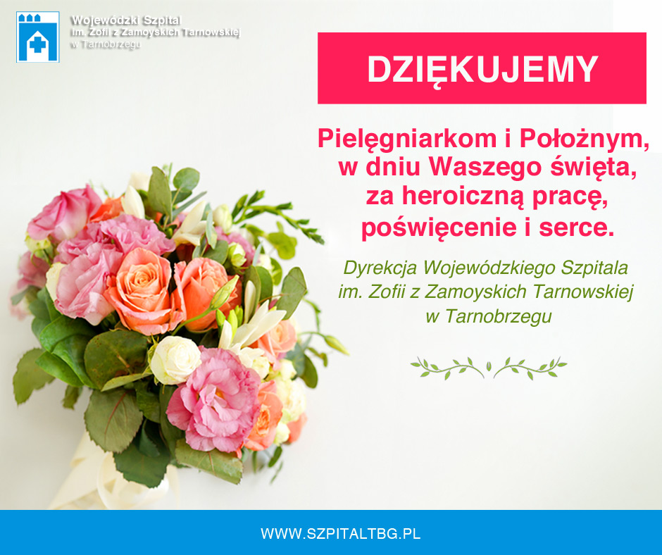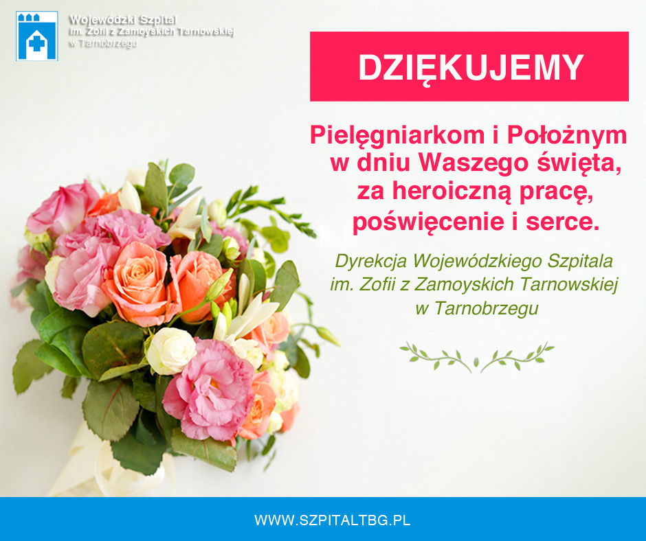 Wszystkim Paniom i Panom wykonującym zawód Pielęgniarki / Pielęgniarza i Położnej, z okazji Waszego święta, serdeczne podziękowania za heroiczną pracę, poświecenie i serce, składa Dyrekcja Wojewódzkiego Szpitala im. Zofii z Zamoyskich Tarnowskiej w Tarnobrzegu.