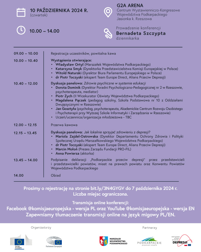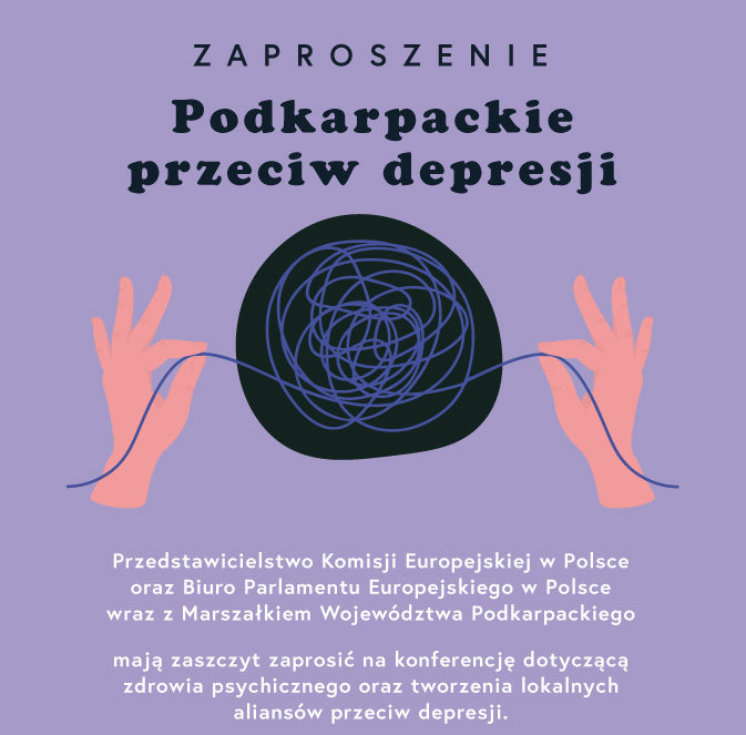 W imieniu Organizatorów zapraszamy do udziału w szczególnym wydarzeniu – konferencji „Podkarpackie przeciw depresji”, która odbędzie się w Światowy Dzień Zdrowia Psychicznego – 10 października br. w G2A Arena Centrum Wystawienniczo-Kongresowym w Jasionce k. Rzeszowa. Organizatorami wydarzenia są Przedstawicielstwo Komisji Europejskiej w Polsce, Biuro Parlamentu Europejskiego w Polsce, Województwo Podkarpackie i Aliansem Przeciwko Depresji.