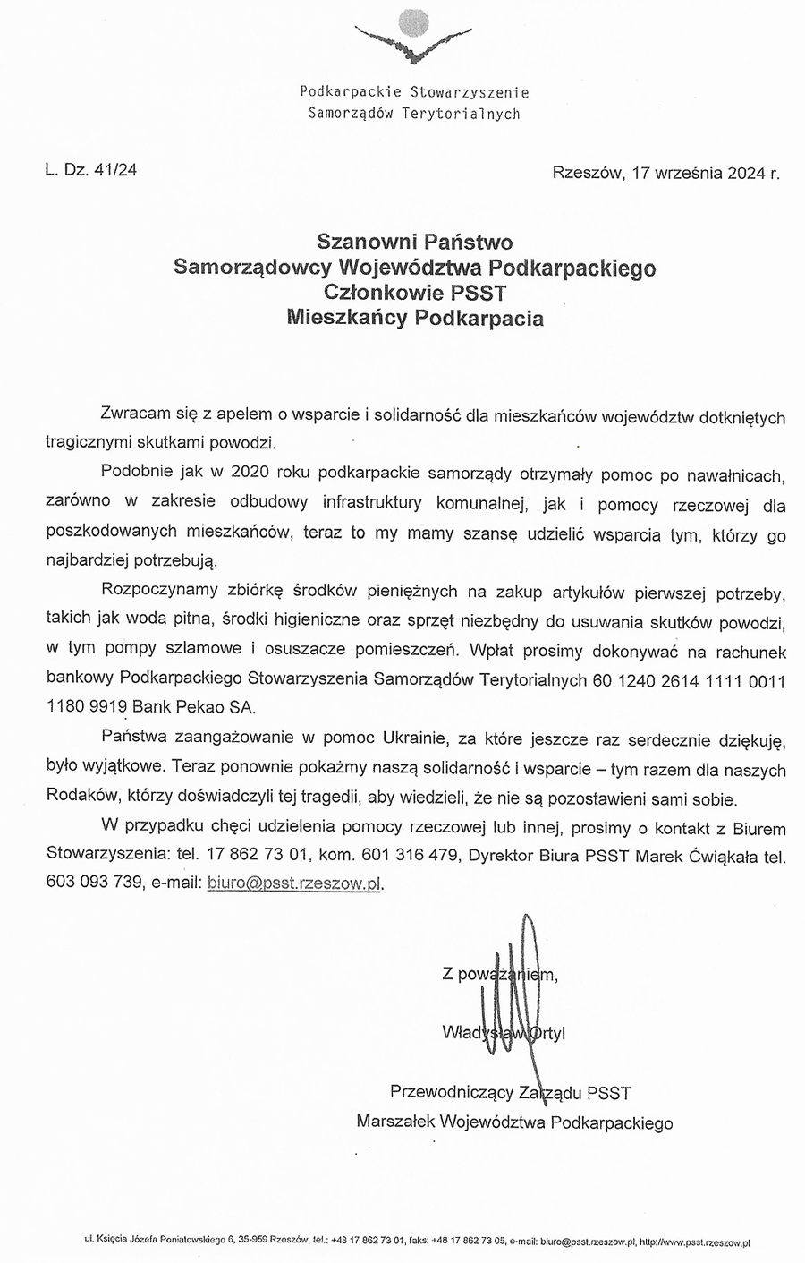 Apel Pana Władysława Ortyla, Przewodniczącego Zarządu Podkarpackiego Stowarzyszenia Samorządów Terytorialnych i Marszałka Województwa Podkarpackiego o wsparcie i solidarność dla mieszkańców województw dotkniętych tragicznymi skutkami powodzi.