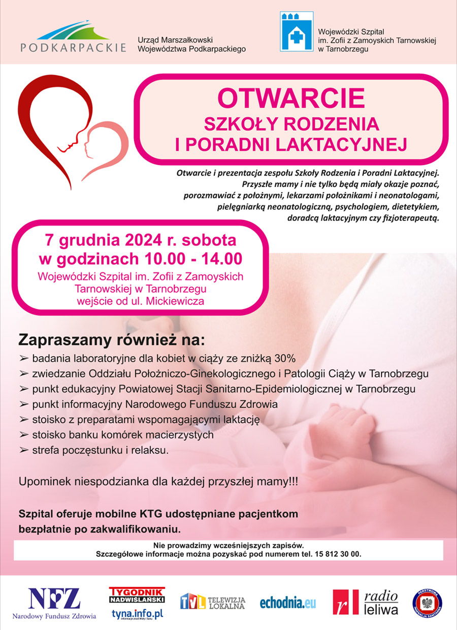 Wojewódzki Szpital im. Zofii z Zamoyskich Tarnowskiej w Tarnobrzegu oraz Urząd Marszałkowski Województwa Podkarpackiego serdecznie zapraszają na uroczyste otwarcie Szkoły Rodzenia i Poradni Laktacyjnej, które odbędzie się w sobotę, 7 grudnia 2024 roku, w godzinach 10:00–14:00.