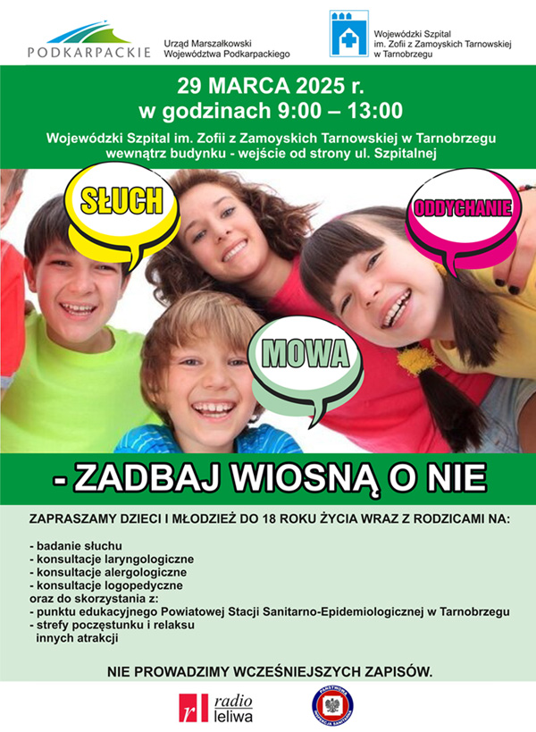 „Słuch, mowa, oddychanie – zadbaj wiosną o nie!” – to hasło przewodnie wyjątkowego wydarzenia medycznego, skierowanego do dzieci i młodzieży. Serdecznie zapraszamy do naszego Szpitala w sobotę, 29 marca 2025 roku, na bezpłatne badania i konsultacje.