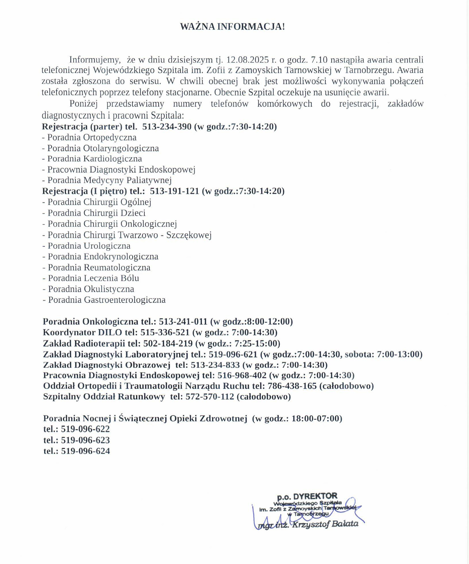 Aktualizacja (14.08.2025): Telefony stacjonarne w szpitalu działają już prawidłowo. Dziękujemy za Państwa cierpliwość.