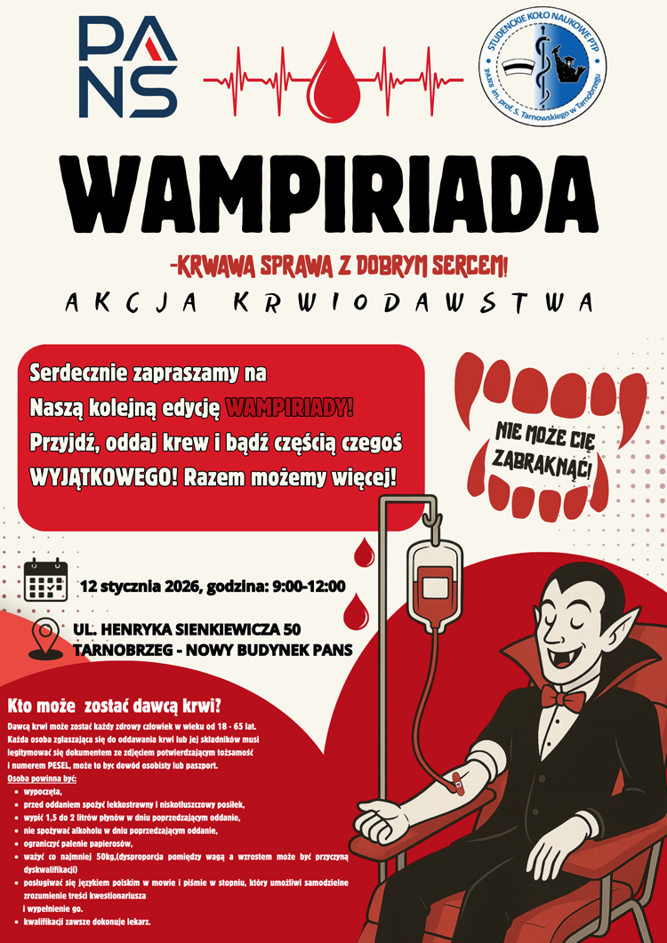 Krew to lek, którego nie da się wyprodukować – możemy ją otrzymać wyłącznie dzięki dawcom. Dlatego zapraszamy mieszkańców regionu do udziału w kolejnej edycji akcji krwiodawstwa organizowanej przez Studenckie Koło Naukowe Polskiego Towarzystwa Pielęgniarskiego w Tarnobrzegu pod nazwą Wampiriada 2026.