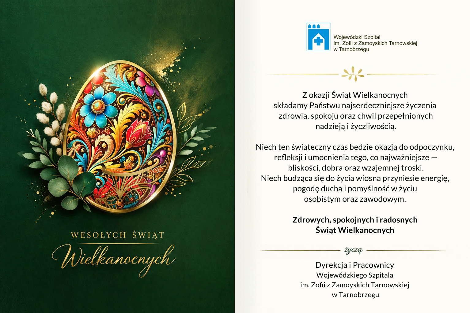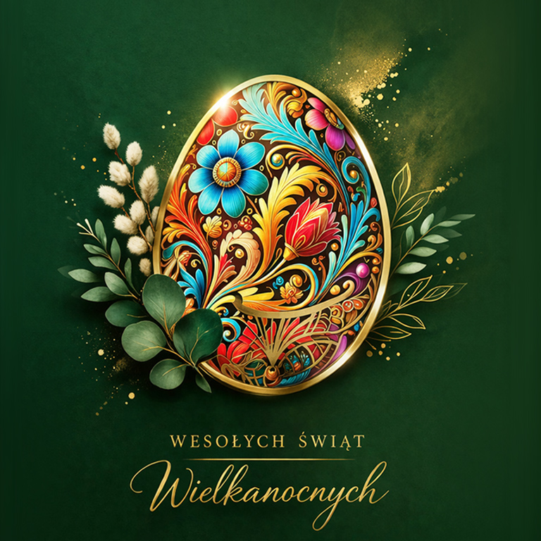 Niech świąteczny czas będzie okazją do odpoczynku, refleksji oraz umocnienia tego, co najważniejsze — bliskości, dobra i wzajemnej troski. Niech budząca się do życia wiosna przyniesie Państwu nową energię, pogodę ducha oraz pomyślność w życiu osobistym i zawodowym.