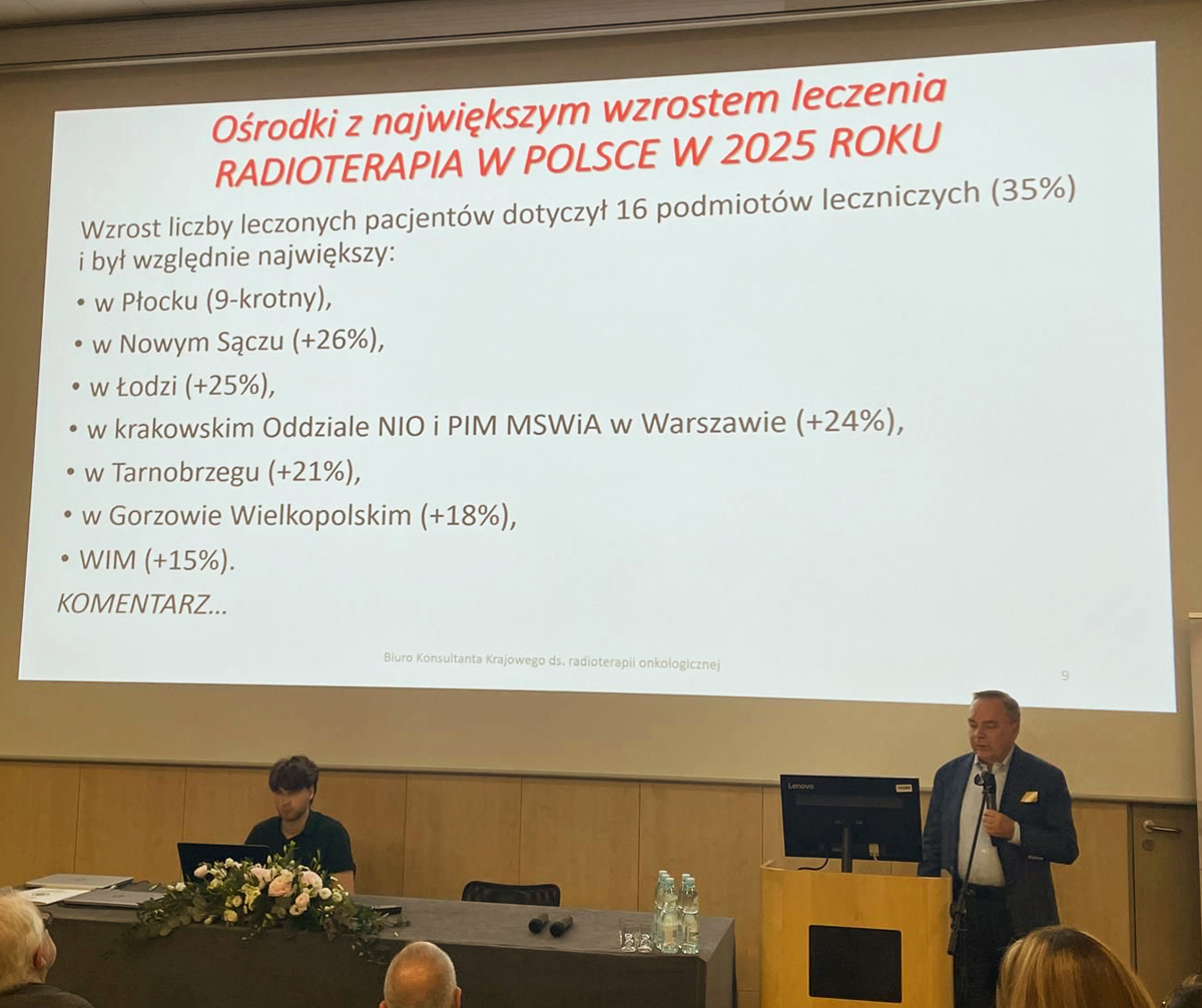 Tym bardziej cieszy nas fakt, że rozwój naszego ośrodka został dostrzeżony również na forum ogólnopolskim. Podczas ostatnich podsumowań branżowych prof. dr hab. n. med. Krzysztof Składowski, Konsultant Krajowy w dziedzinie radioterapii onkologicznej, wyróżnił Zakład Radioterapii w Tarnobrzegu jako jeden z pięciu ośrodków w Polsce z największym wzrostem liczby leczeń w 2025 roku.